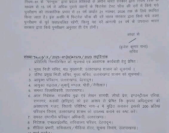 देहरादून : मुख्यमंत्री पुष्कर सिंह धामी के निर्देश पर राज्य सरकार ने उत्तराखण्ड के वाहन स्वामियों को महत्वपूर्ण राहत प्रदान करते हुए पुराने (15 वर्ष) कमर्शियल वाहनों की फिटनेस फीस में वृद्धि को आगामी 21 नवंबर 2026 तक स्थगित कर दिया है। इस संबंध में सचिव,परिवहन बृजेश कुमार संत द्वारा अधिसूचना जारी कर दी गई है।