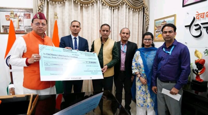 देहरादून : मुख्यमंत्री पुष्कर सिंह धामी से मुख्यमंत्री आवास में केनरा बैंक के प्रतिनिधिमंडल ने शिष्टाचार भेंट की। इस दौरान बैंक की ओर से मुख्यमंत्री राहत कोष के लिए 25 लाख रुपये की धनराशि का चेक भेंट किया गया।