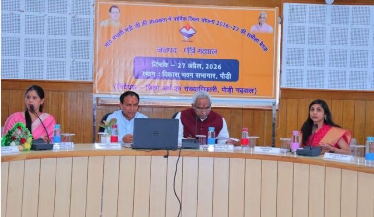 पौड़ी : मुख्यमंत्री पुष्कर सिंह धामी के निर्देशन में जनपद पौड़ी गढ़वाल में जिला योजना वर्ष 2026-27 के प्रस्तावित परिव्यय पर चर्चा एवं समग्र समीक्षा के लिए विकास भवन सभागार में एक महत्वपूर्ण बैठक आयोजित की गयी। बैठक की अध्यक्षता जनपद के प्रभारी मंत्री (पंचायती राज, आपदा प्रबंधन एवं पुनर्वास, आयुष एवं आयुष शिक्षा, पुनर्गठन एवं जनगणना) मदन कौशिक ने की। जनपद आगमन पर जिलाधिकारी स्वाति एस. भदौरिया, मुख्य विकास अधिकारी गिरीश गुणवंत तथा अन्य अधिकारियों ने पुष्पगुच्छ भेंट कर प्रभारी मंत्री, कैबिनेट मंत्री डॉ धन सिंह रावत तथ अन्य अतिथियों का स्वागत किया।