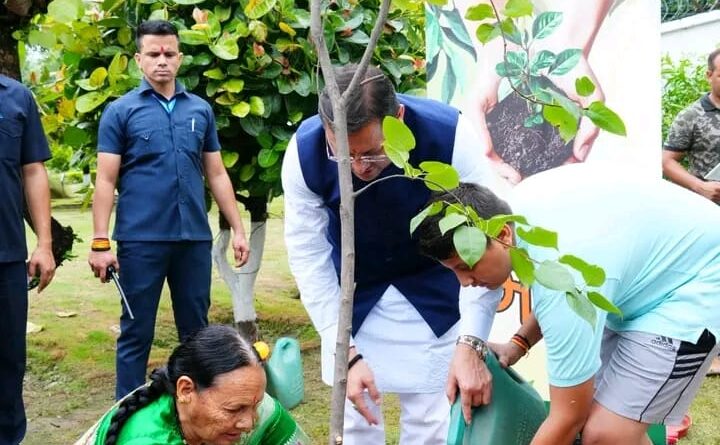 एक पेड़ मां के नाम अभियान के तहत मुख्यमंत्री धामी ने अपनी माताजी बिशना देवी और सुपुत्र दिवाकर  के साथ किया पौधारोपण